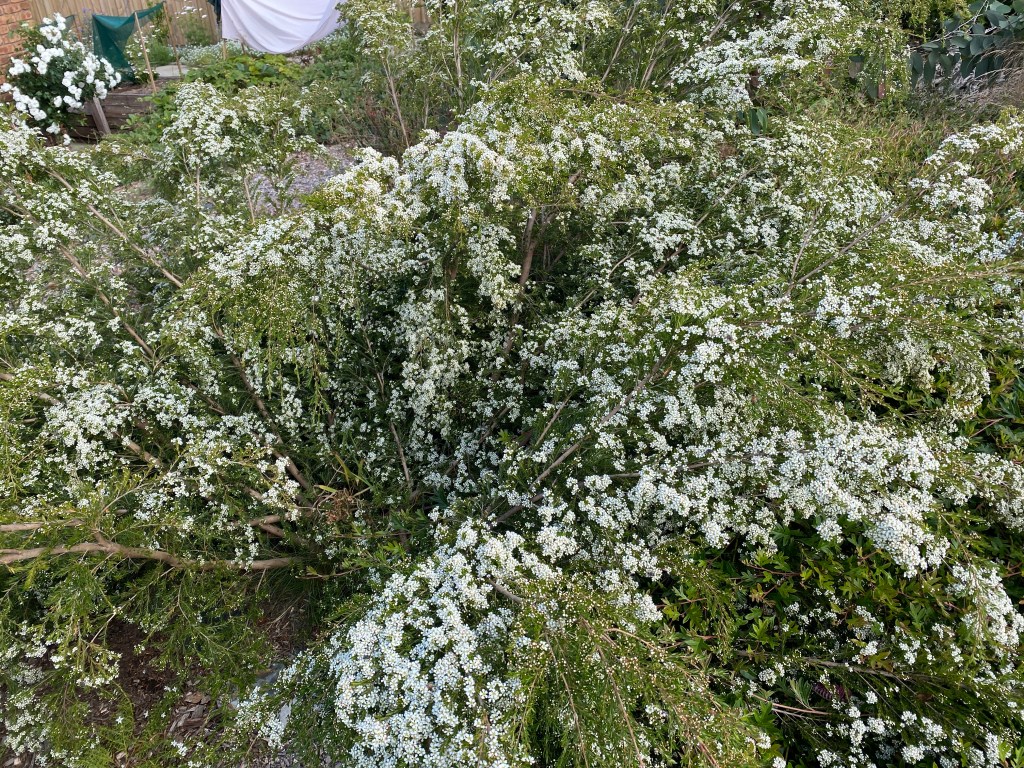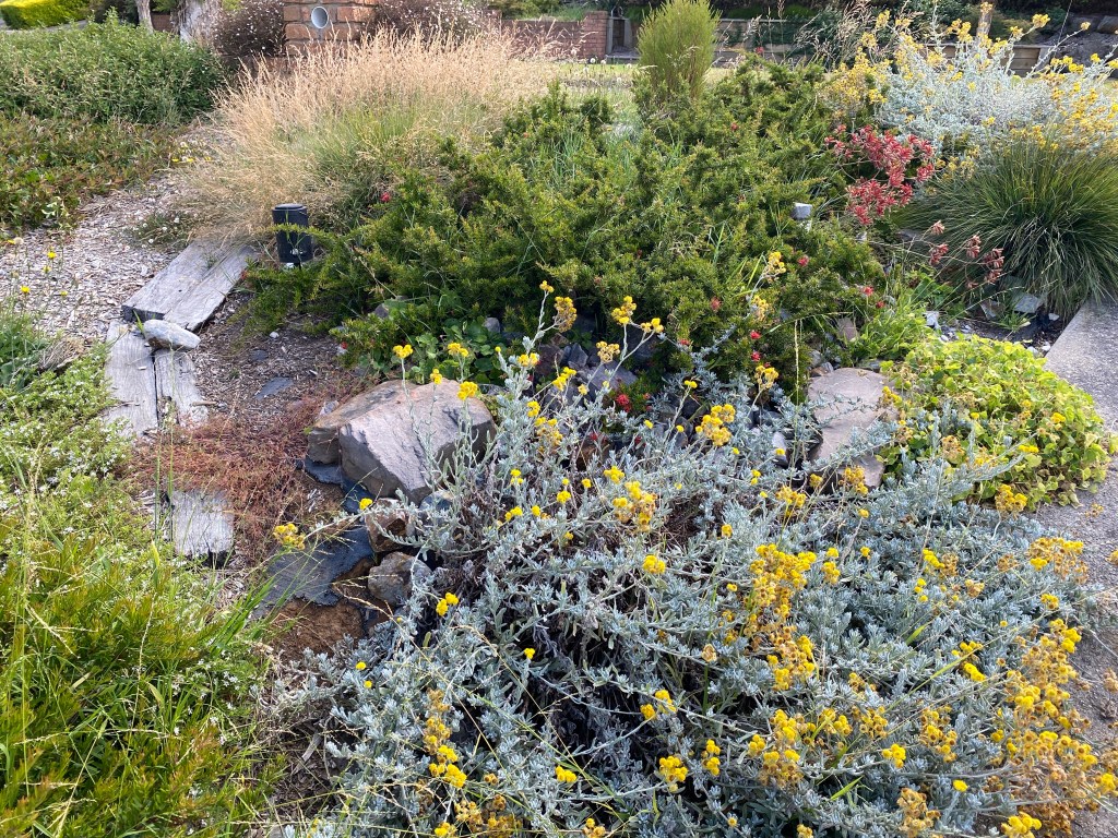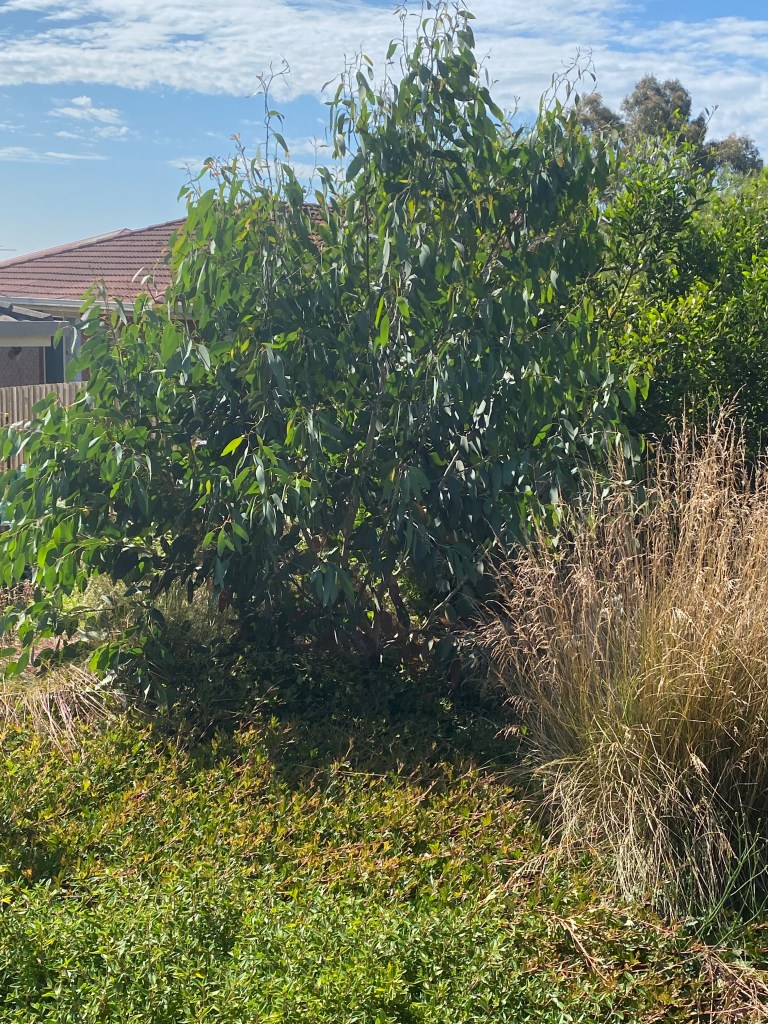 Earlier, years earlier, sick of mowing and grass and monocultures, I transformed our front yard into a small piece of native bushland. Grevillea, boronias, and myrtles. Kangaroo Paws, a NSW Waratah, and my treasure, a Grass Tree. And A Suggan Buggan grass for funsies. These all grow in the spaces around the Snow Gum.